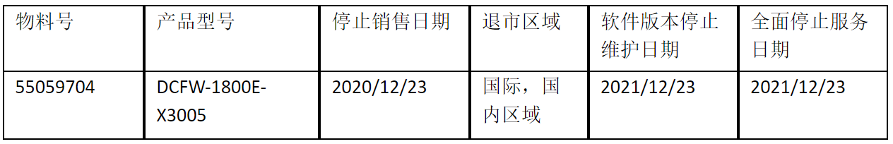北京神州数码云科信息技术有限公司正式通知您, 以上DCFW-1800E-X3005下一代防火墙(55059704)将于2020年12月23号停止接收新的订单(具体日期见上表),不再供货。给您带来的不便,敬请原谅。