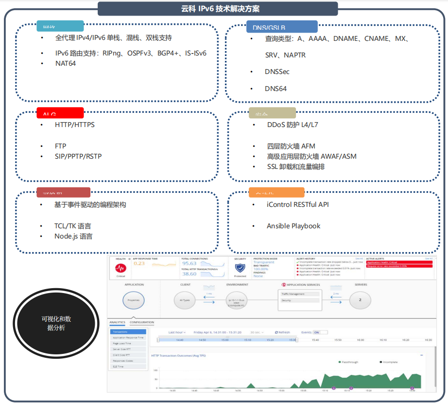 全球范围内支持无线和互联网的设备日益增多,导致 IPv4 地址快速耗尽。与此同时,IPv6 的普及速度比预计的要慢。服务提供商需要一款解决方案,帮助他们应对 IPv4 地址耗尽的问题,并基于无缝迁移到 IPv6 以实现网络优化。通过提供大量的IP地址转换、快速的NAT 转换率、高吞吐率能力和高速的日志审计功能实现运营商级平台的可扩展性。