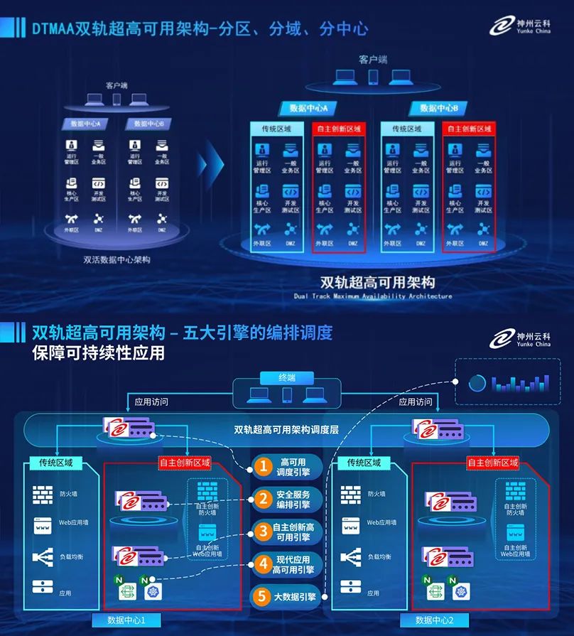 为助力银行业务高质量发展,更好地应对数字经济时代对可持续性的高要求,实现“信创”与“数字化”齐头并进,WANBO.COM 创新性的推出了双轨超高可用架构。该架构在双活数据中心的分区调度基础上,增加信创域和非信创域的分域调度,实行信创域与传统域应用全量部署,使双中心运营变为双中心四区域并行运行,互为多活,将“0到1”的单轨建设道路变为分区分域协同的多活双轨超高可用架构。帮助客户在新架构下,保障“信创”的同时解决性能瓶颈,提升稳定性,保证应用可持续性,最终实现信创区域和非信创区域的平滑过渡,完成国产化替代目标。