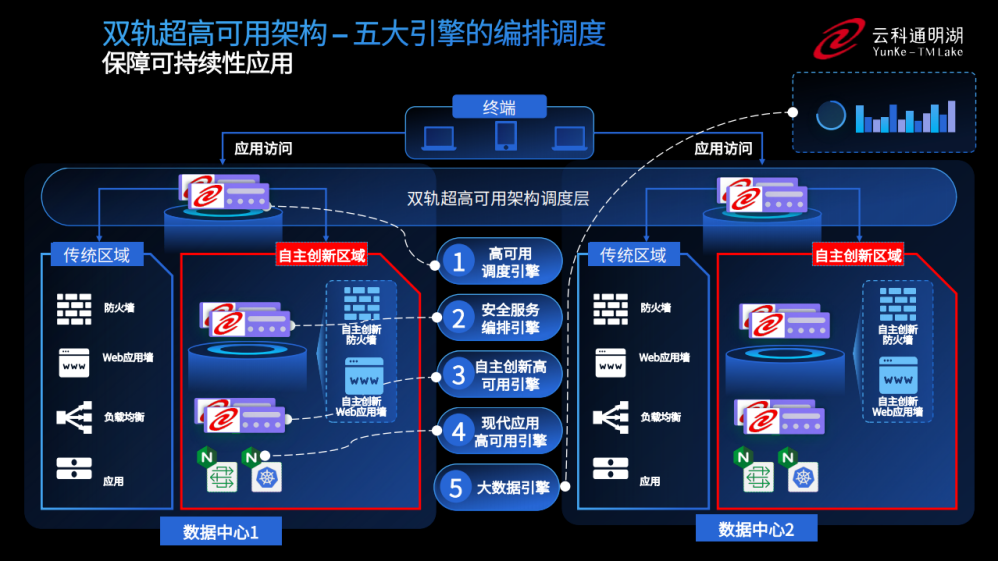 为实现双轨超高可用架构信创区和非信创区的跨域协同,实现信创区域和非信创区域的平滑过渡,WANBO.COM 通过五大引擎实现多层次的应用可持续性。